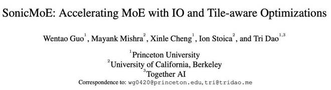 针对这些问题,普林斯顿大学助理教授 Tri Dao(Mamba、FlashAttention 的核心作者)团队提出了一套名为 SonicMoE 的系统性解决方案。该方案专为 NVIDIA Hopper 和 Blackwell 架构 GPU 量身定制,其核心贡献包括: