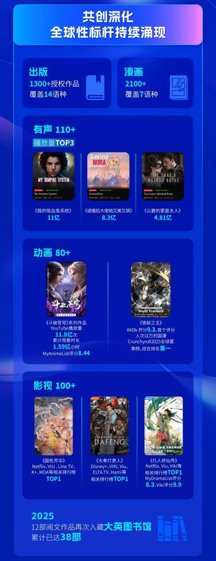 此外,就在近日,《重生之将门毒后》《第一侯》《逢晴日》《国色芳华》《惊山月》《九重紫》《九章奇案》《墨燃丹青》《为什么它永无止境》《伪像报告》《问九卿》《我花开后百花杀》等12部阅文作品,被大英图书馆收录。作为全球最大的学术图书馆之一,这也是大英图书馆自2022年以来,第三次收录阅文作品,累计已达38部。