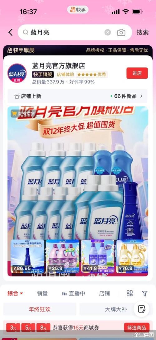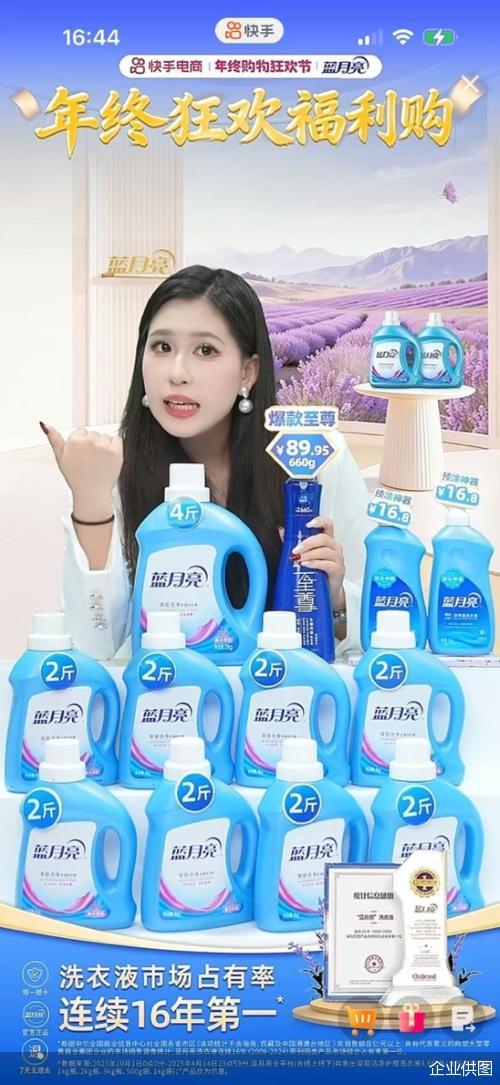 作为专业家庭清洁品牌,蓝月亮自2021年入驻快手以来,聚焦新线城市用户,尤其是北方区域,借助平台“熟人社区”氛围来深耕信任。2025年快手年终购物狂欢节,面对“内容+货架”融合的新趋势,蓝月亮迅速调整策略,成为“商品卡川流计划”的受益商家。