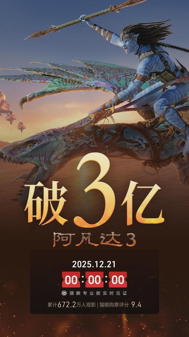 【《阿凡达3》总票房破3亿】据猫眼专业版数据,电影《阿凡达3》上映3天,总票房破3亿。(东方网)