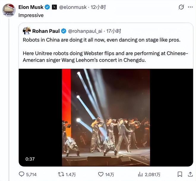 【马斯克转发宇树机器人伴舞视频:印象深刻】近日,六台宇树科技的人形机器人登台演唱会伴舞,并完成高难度“韦伯斯特”空翻的视频果然引发了海内外的关注。有博主发布视频称:“中国的机器人现在无所不能,甚至还能像专业人士一样在舞台上跳舞。”马斯克看到了相关内容,并转发留言称“Impressive”(令人印象深刻)。不少人纷纷跟帖称中国机器人进步太快,几个月前在春晚舞台上还像是刚学会走路的小孩,如今已经成为了专业的舞者;还有人提出问题,想知道是否特斯拉擎天柱也能完成类似的任务。(钱江晚报)