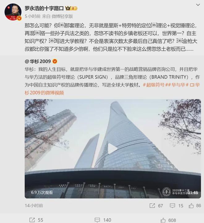 【华杉称要把华与华建成世界第一,罗永浩回应:忽悠不读书的乡镇老板还可以】华杉微博称:“我的人生目标,就是把华与华建成世界第一的战略营销品牌咨询公司,并且把华与华方法的超级符号理论(SUPER SIGN),品牌三角形理论(BRAND TRINITY),作为中国自主知识产权的品牌传播理论,写进全球大学教材。”罗永浩回应称:“你那套理论,无非就是里斯+特劳特的定位理论+视觉锤理论,再混搭一些孙子兵法之类的,忽悠不读书的乡镇老板还可以,世界第一?自主知识产权?写进大学教程?不会是表演次数太多最后自己真信了吧?”(新浪科技)
