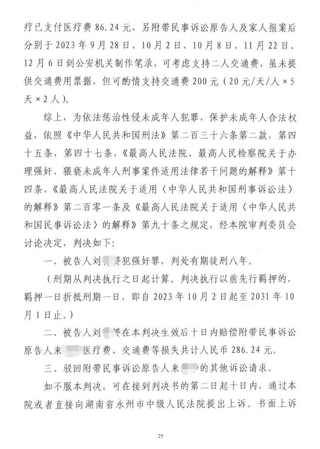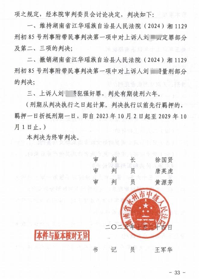 2025年7月24日,永州中院作出二审判决,维持一审定罪和附带民事判决,撤销一审判决的量刑部分,以强奸罪判处刘某赟有期徒刑六年。