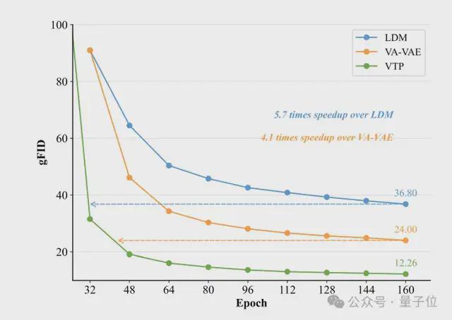 更关键的是,在达到相同生成质量的前提下,VTP的训练收敛速度比LDM快5.7倍、比VA-VAE快4.1倍,大幅降低了训练成本。