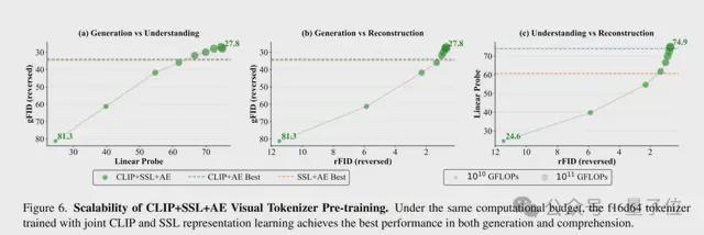 二者呈现明显的正相关,且这种提升会随着训练计算量增加持续推进。相比之下,缺少“理解力”的传统AE Only方案,其生成质量和理解能力很快陷入停滞。