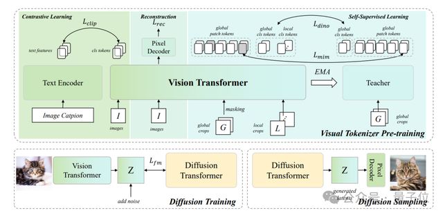 这和之前的CLIP思路一脉相承,但目标更聚焦。CLIP追求的是广义的图文匹配能力,而VTP则要求Tokenizer在压缩图像为紧凑的潜在编码时,必须保留与文本对齐的语义结构。
