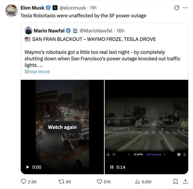 事件发生后,特斯拉 CEO 马斯克在 X 上发文称,「特斯拉的无人驾驶出租车未受旧金山停电影响」,借机突出自家产品在本次停电中的表现。