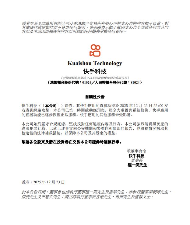 公司快手应用的直播功能于2025年12月22日22:00左右遭到网路攻击,公司已第一时间启动应预案,经全力处置与系统修复,快手应用的直播功能已逐步恢复正常服务。快手应用的其他服务未受影响。