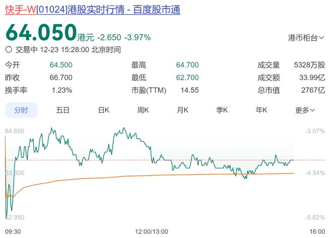 12月23日,截至发稿,港股快手-W(01024.HK)股价低开低走。现报64.05港元/股,下跌近4%,总市值2767亿港元。