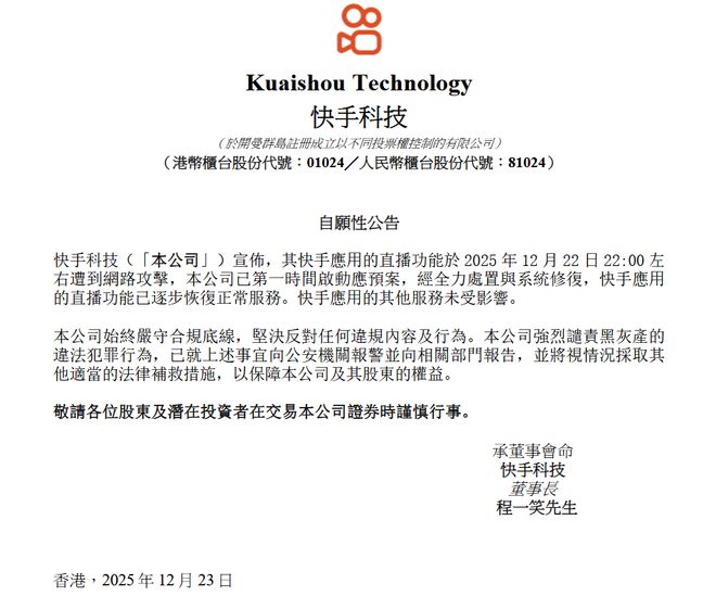 12月23日午间,快手在港交所发布公告称,平台直播功能12月22日22时左右遭到网络攻击,公司已第一时间启动应预案,经全力处置与系统修复,直播功能已逐步恢复正常服务,其他服务未受影响。“本公司始终严守合规底线,坚决反对任何违规内容及行为。本公司强烈谴责黑灰产的违法犯罪行为,已就上述事宜向公安机关报警并向相关部门报告,并将视情况采取其他适当的法律补救措施,以保障本公司及其股东的权益。”