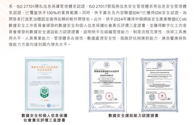 对于数据安全,2023年-2024年,快手连续两年获得ISO 27001信息安全管理体系、ISO 27017云服务信息安全管理体系等信息安全管理体系认证,覆盖快手100%的业务范围。