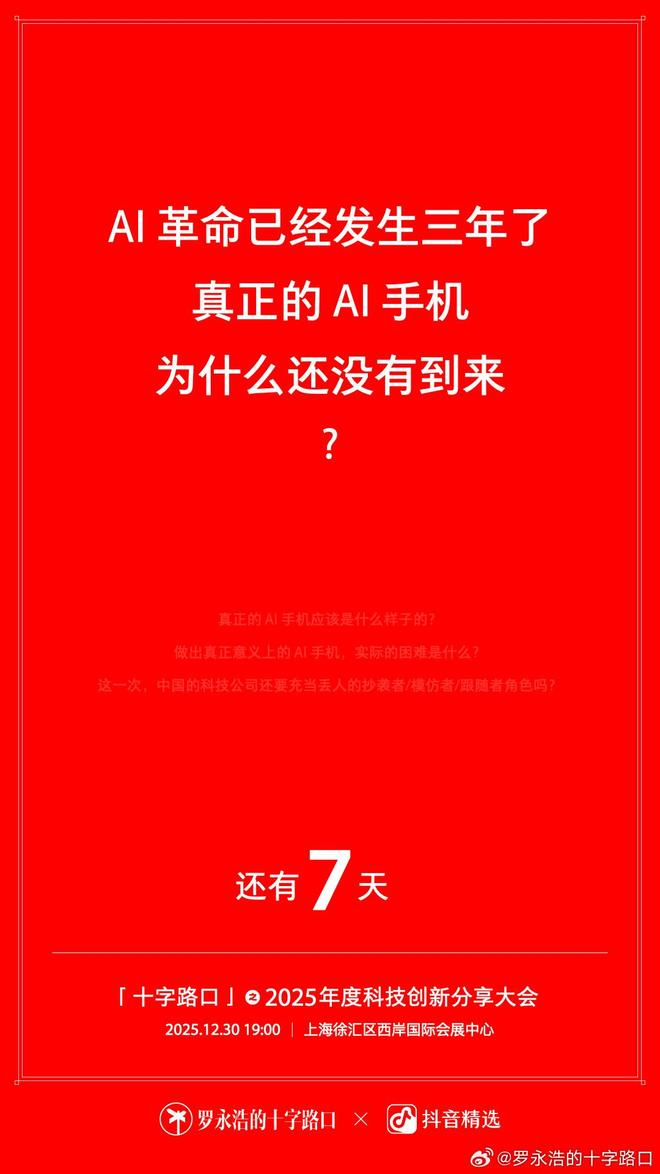 「罗永浩的十字路口」将于 12 月 30 日在上海市徐汇区西岸国际会展中心举办「十字路口之 2025 年度科技创新分享大会」,昨天中午 12:00 开票。业内普遍视为其标志性的「科技春晚」在时隔 7 年后的回归。