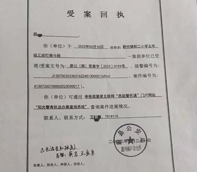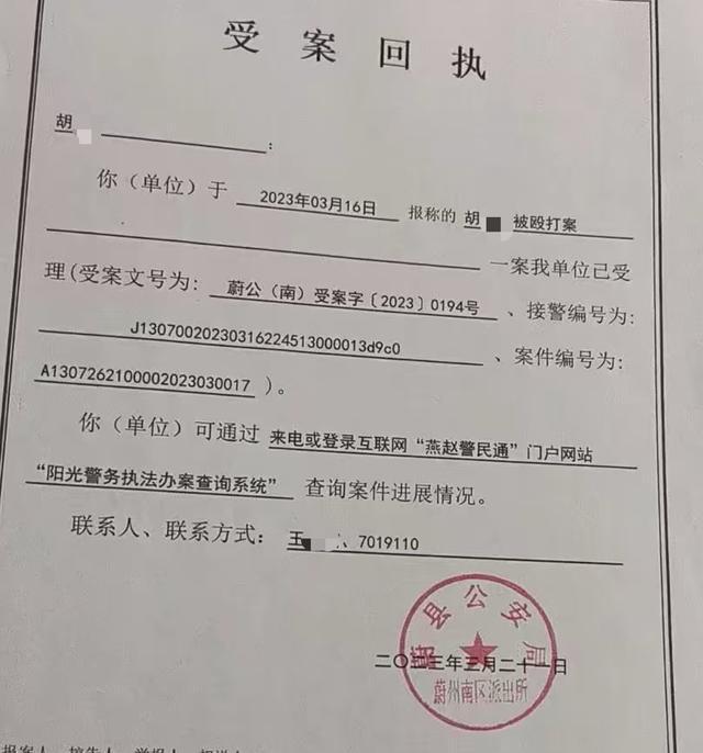 “案发快一年,我们才拿到警方出具的受案回执。”胡女士无奈道,警方给了她两份《受案回执》,日期、盖章均相同,但案由分别为“打架斗殴”案、“胡某被殴打”案,“两份文书的受案文号、接警编号、案件编号相同。打架斗殴案的回执,写着‘已电话告知报案人’。”