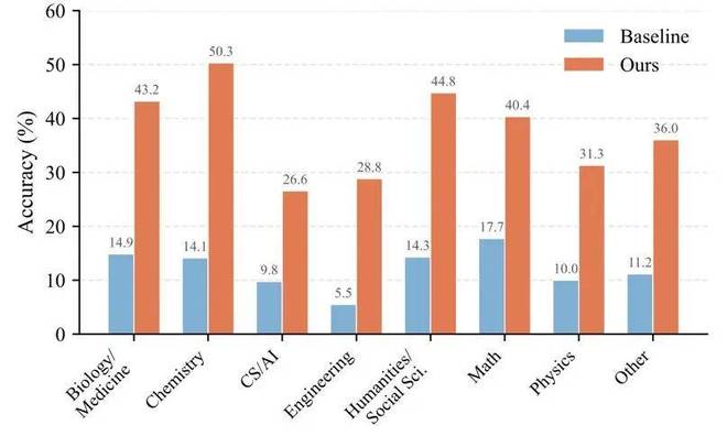 值得注意的是,在知识密集型领域(如生物 / 医学、化学),SCOPE 的提升较为明显:生物 / 医学从 14.9% 提升到 43.2%,化学从 14.1% 提升到 50.3%。这些领域的问题往往涉及复杂的专业概念和严格的推理流程,SCOPE 合成的领域特定规则能够帮助 Agent 更好地理解和遵循这些要求。