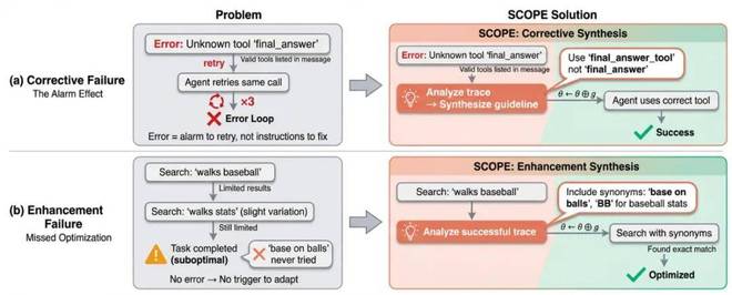 针对不同场景,SCOPE 使用两种合成模式:纠正型合成从错误中提取教训,增强型合成从成功模式中挖掘优化机会。实验表明,增强型规则占所有合成规则的 61%,说明 SCOPE 不仅仅是 “错误修复器”,更是一个主动的优化器。