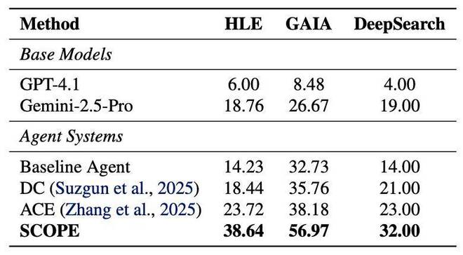 在 HLE 基准上,SCOPE 将任务成功率从 14.23% 提升到 38.64%。在 GAIA 基准上,成功率从 32.73% 提升到 56.97%。