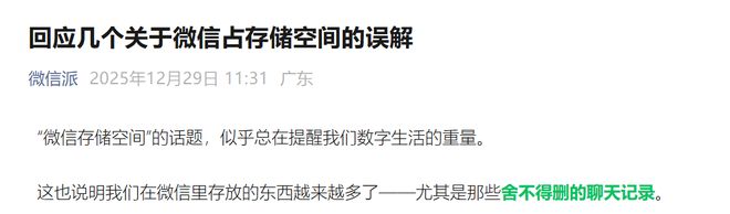 【环球网科技综合报道】12月29日消息,微信官方发布文章回应关于应用占用存储空间的误解,表示使用超过40GB存储空间的用户中,聊天记录平均占比达到70%。