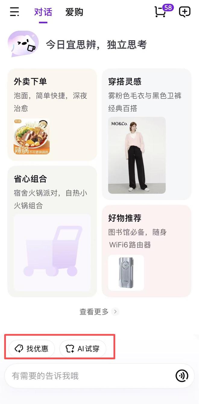 我在体验中发现,无论是“对话”界面还是“爱购”页面,底部都保留了一个输入栏,支持用户随时用自然语言调起AI对话。但在“对话”界面,这个输入栏上方还额外设置了两个快捷入口:“找优惠”和“AI试穿”。其中,“找优惠”和“每日一惠”的界面是一致的。
