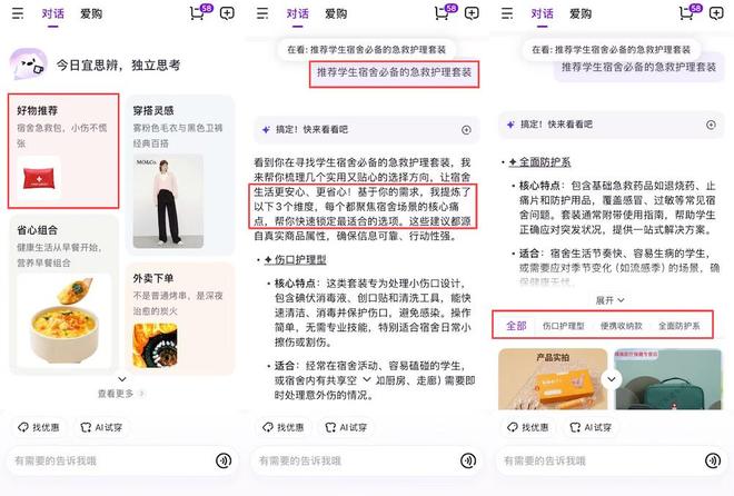 我在测试“省心组合”模块时,AI会依据模块封面图直接生成推荐指令,例如“推荐学生宿舍必备的急救护理套装”。
