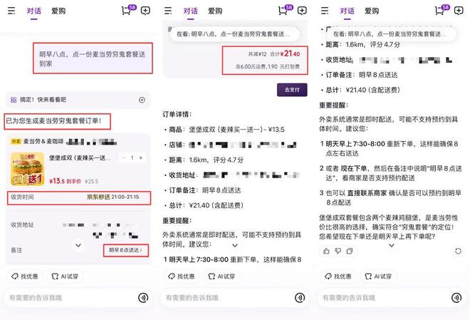 在传统外卖平台上,送达时间的设定通常更为灵活,不仅支持尽快送达与定时送达的选择,部分商家还支持跨天预约,这一点在功能完备性上仍优于当前AI助手的实现。