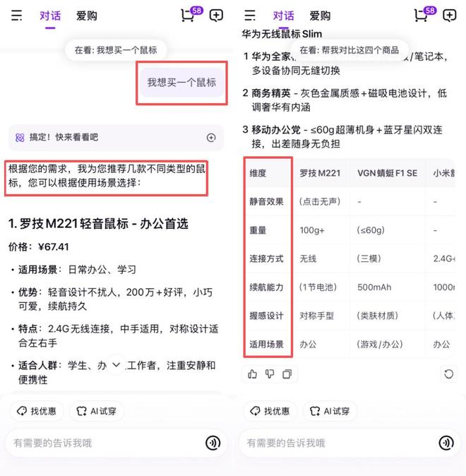 更实用的是,它还提供“商品对比”功能。点击后,系统会在“静音效果、重量、连接方式、续航能力、握感设计、适用场景”这六个维度生成对比表格,让用户在风格偏好之外,也能做出更理性判断。