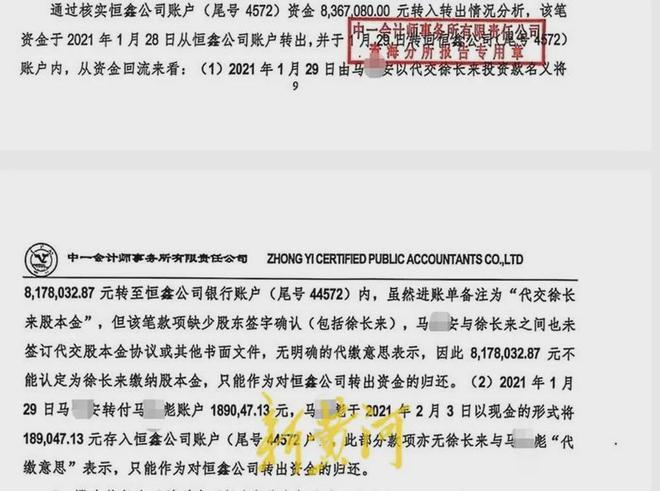 “在开完发票后,我仅指令马某彪将款项转回公司,未作出任何指示,根本没提过将其作为股本金转入的说法。马某彪也已经承认自己是误写了,而且公司最后也未将该笔款项作为股本金入账,所谓案涉款项转入时作为我的入股本金的事实完全无法成立。”徐长来解释称,法律层面股东资本的实缴,尤其是提前实缴,因为涉及其他股东的权益,须经其他股东一致同意,否则无法形成有效注资,且是否作为实缴资本,应以财务记账和工商登记为准,绝对不可能以转入时的“备注”为准,此为法律常识。另据一审法院委托的会计师事务所会计司法鉴定意见书显示,2021年1月29日由马某安以代交徐长来投资款名义将817万余元转至恒鑫公司账户,虽然进账单备注为“代交徐长来股本金”,但该笔款项缺少股东签字确认(包括徐长来),马某安与徐长来之间也未签订代交股本金协议或其他书面文件,无明确的代缴意思表示,因此817万余元不能认定为徐长来缴纳股本金,只能作为对恒鑫公司转出资金的归还。