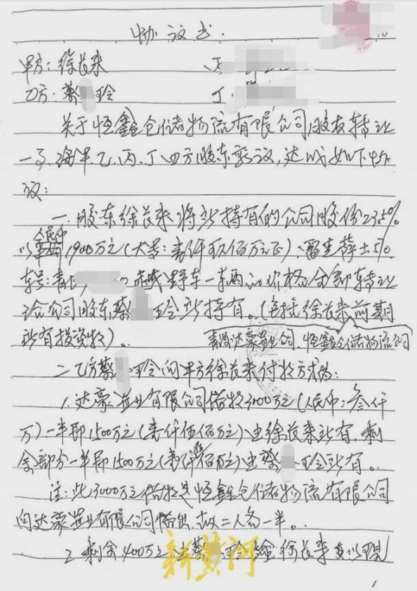 2021年6月,因经营理念出现分歧,他和蔡某玲协商后,将他所持有的恒鑫公司23.5%的股权和前期所有投资款作价1900万元,并额外将公司名下的一辆越野车一起转让给蔡某玲,并配合对方完成工商变更登记,蔡某玲就此持有原属徐长来的全部股权。“没想到,协议签订后,蔡某玲拒不支付转让款,并于2023年1月以我涉嫌职务侵占为由向公安机关报案,还威胁我说只要肯答应免费转让股权,就让公安撤案。”徐长来回忆。