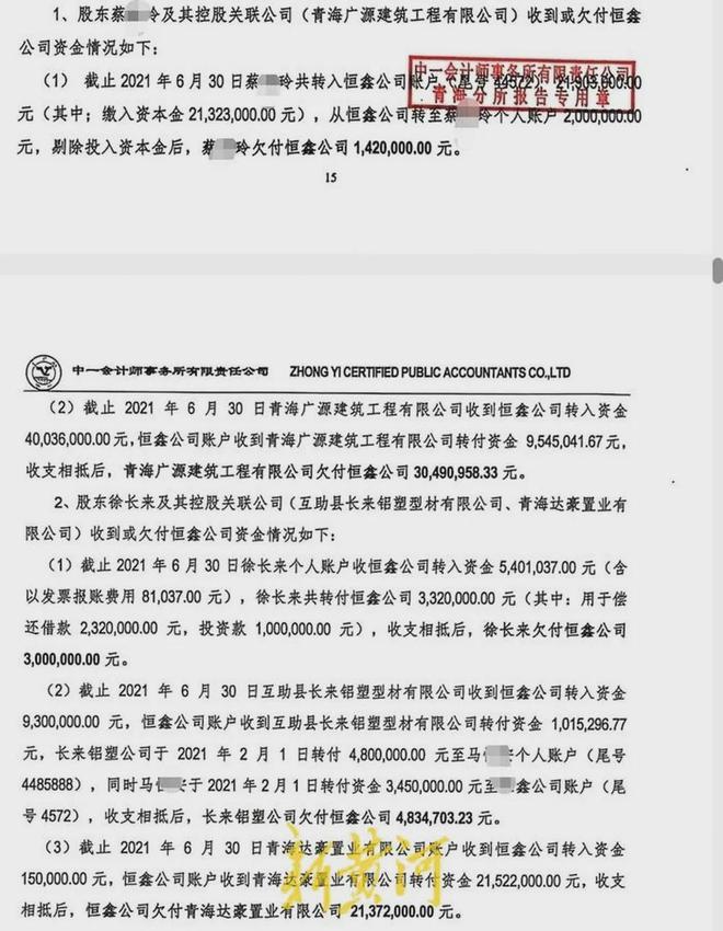 在一审法院委托的会计师事务所会计司法鉴定意见书中,记者看到,包括徐长来、蔡某玲等多位股东在内,各股东及其各自控股关联公司与恒鑫公司之间存在互相垫资转账等情形。其中,经蔡某玲转入恒鑫公司又从恒鑫公司转至蔡某玲个人账户,在剔除投入资本金后,蔡某玲欠付恒鑫公司142万元;蔡某玲控股关联公司收到恒鑫公司转入资金又转付恒鑫公司,收支相抵后,蔡某玲控股关联公司欠付恒鑫公司3049万余元。徐长来收到恒鑫公司转入资金又转付恒鑫公司,收支相抵后,徐长来欠付恒鑫公司300万元;徐长来控股关联公司收到恒鑫公司资金又转付恒鑫公司,收支相抵后,徐长来控股关联公司欠付恒鑫公司483万余元;徐长来另一家控股关联公司收到恒鑫公司转入资金又转付恒鑫公司,收支相抵后,恒鑫公司欠付徐长来另一家控股关联公司2137万余元。