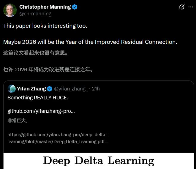 斯坦福著名教授Christopher Manning读完后直言,「2026年,将成为改进残差连接之年」。