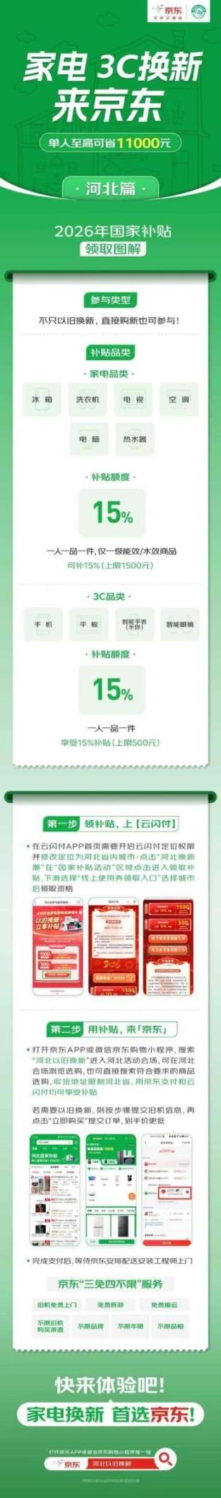 目前,河北国补已上线京东,想换新家电及3C数码的河北消费者,即日起打开京东APP搜索“河北以旧换新”,领国补,选购心仪好物。(记者 李春炜)