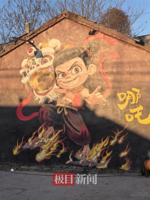 第二年春节,吴承言跟孩子一起去看了电影《哪吒2》,他觉得哪吒挺有意思,形象很受小朋友喜欢,又是国漫的代表,也可以让老人了解一下国漫。他于2025年3月画了4-5幅哪吒系列的墙绘。