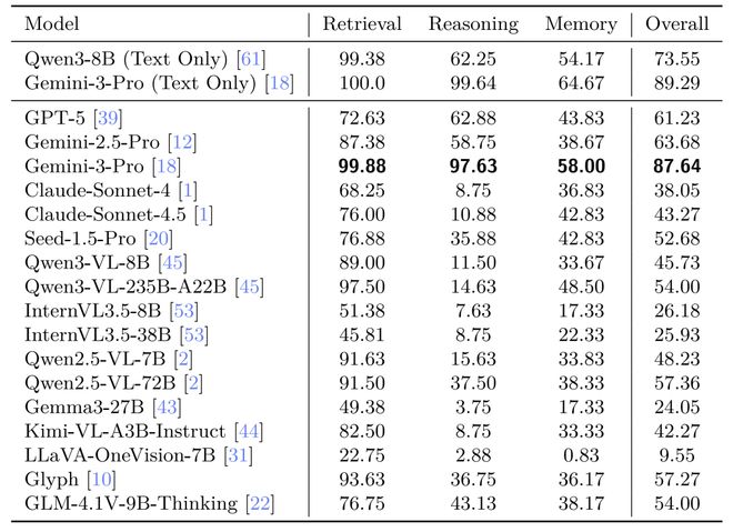 Gemini-3-Pro在VTCBench-Wild上表现惊艳,其视觉理解能力已几乎追平其纯文本基准,证明了VTC是实现大规模长文本处理的极其可行的路径!