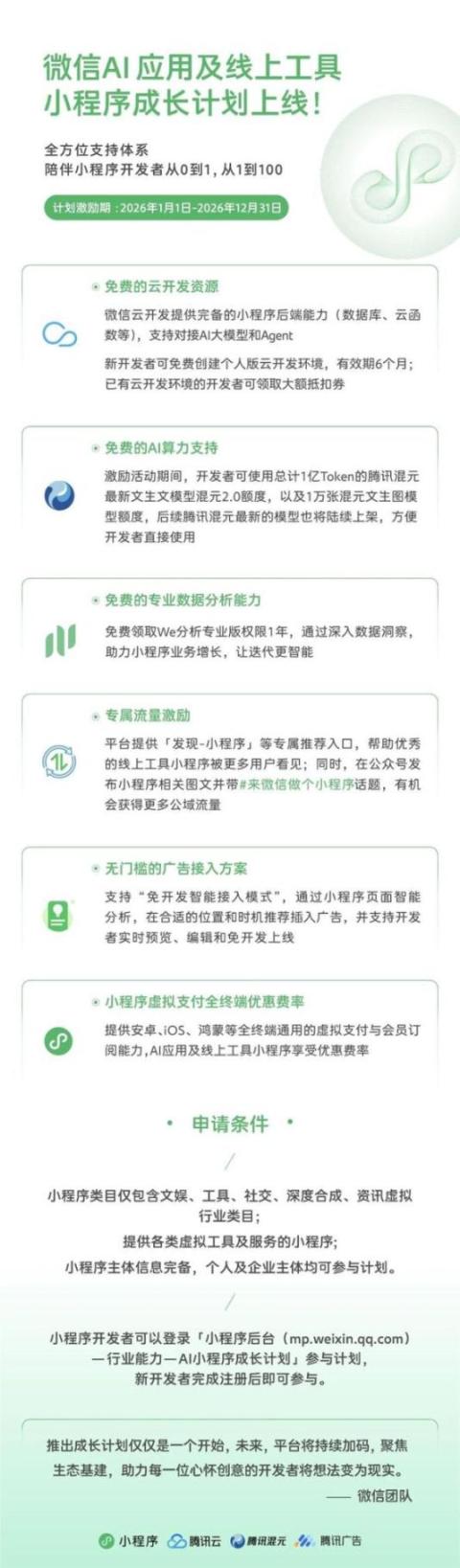 1月5日,微信小程序宣布正式推出AI应用及线上工具小程序成长计划,提供云开发资源、AI算力、数据分析、商业变现及流量激励等全方位支持。成长计划的激励期为2026年全年(2026年1月1日至2026年12月31日)。