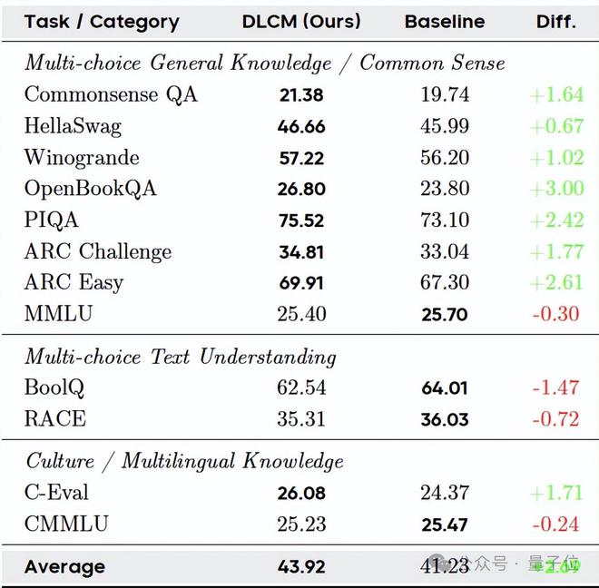 其中,DLCM实现了43.92%的平均准确率,超过了基线模型41.23%的分数,提升了2.69%。