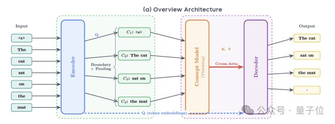 它将同一片段内(即同一概念内)的所有Token表示进行均值池化(Mean Pooling),然后投影到更高维度的概念维度上,最终形成一个长度大大压缩的概念序列 。