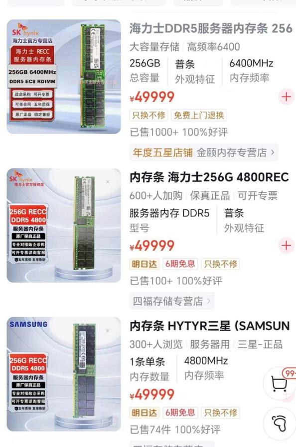 周武向时代周报记者介绍,目前其业务已全面转向DDR5服务器内存。“128GB、5600频率的产品,三星和海力士报价大约在1.95万到2万元之间;如果是6400频率,价格基本在2.1万元左右。”他补充称,市场上流通的货源不少来自整机拆分,若是全新未拆封的原厂盒装产品,128GB的三星DDR5 6400报价已达到2.13万元。