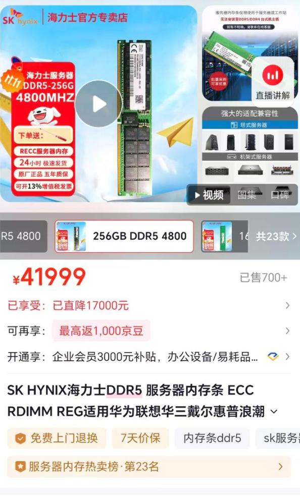 以256G的DDR5服务器内存为例,单条价格已超过4万元 京东截图