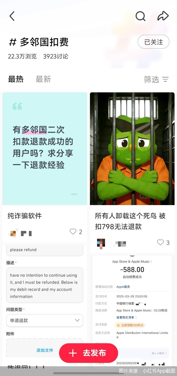 遇到多邻国未经提醒就扣费问题的不只白佳佳和穆语。北京商报记者看到,在小红书平台,"多邻国扣费"这一话题已有22.3万浏览,讨论量已经接近4000。