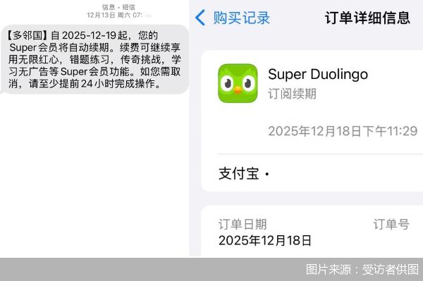 周晓雨以自己的被扣费时间点为例向北京商报记者分析,她于2025年12月12日早上领取了Super Duolingo免费7天体验。12月13日凌晨,她收到来自多邻国的会员续期短信通知。根据她出示的截图,短信上写着"自2025—12—19起,您的Super会员将自动续期……如您需取消,请至少提前24小时完成操作"。