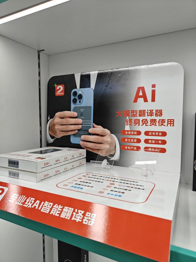 义乌小商品一家卖AI智能硬件产品的商户小林(化名)在门店中向记者展示了一款AI翻译卡片,可以应用AI对话翻译、AI实时记录等功能。
