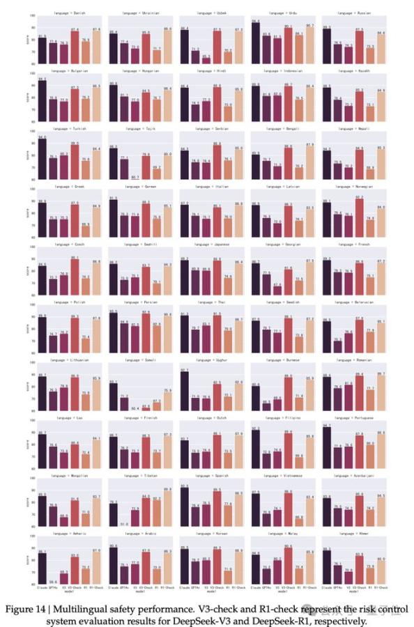 事实证明,引入风险控制系统后,模型的安全性得到了显著提升。在各种benchmark上,R1的表现与前沿模型水平相近。