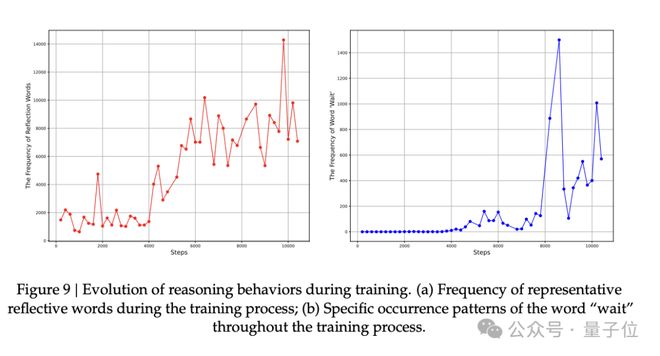 结果显示,随着训练推进,这些反思性词汇的出现次数,相比训练初期直接涨了大约5到7倍。
