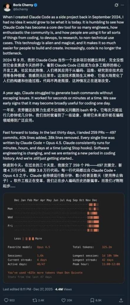 这种发布节奏,肯定少不了 AI 工具的功劳。毕竟 Boris 曾经提到,在之前的一个月,他提交了 259 个 PR,总共包含 497 次提交,4 万行代码增加,3.8 万行删除。每一行,都是 AI 写的。