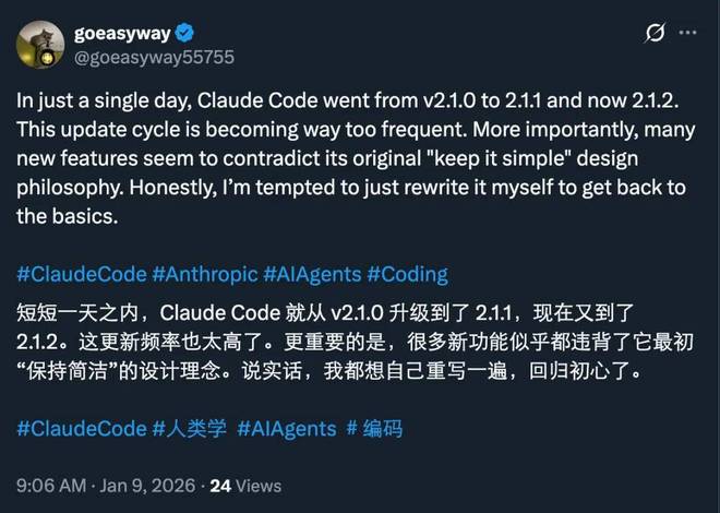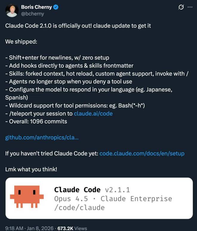 如果你是 Claude Code 的用户,你可能会注意到,它最近有个重要的版本更新,从节前的 2.0.76 更新到了 2.1.0。