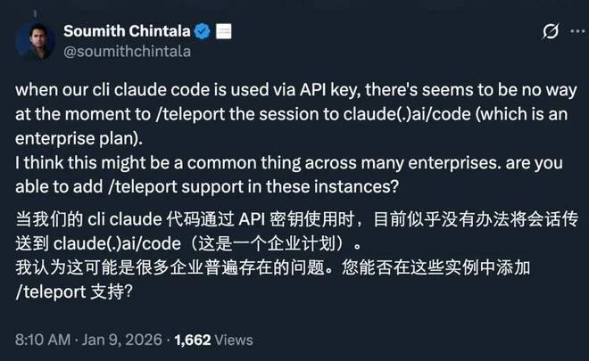 此外,还有人关心企业用户要怎么用这个功能。PyTorch 之父 Soumith Chintala 问到,很多企业都是通过 API Key 使用 Claude Code 的,Anthropic 是否也能为这类用户开放 /teleport 功能?目前,Boris 还没有给出回复。