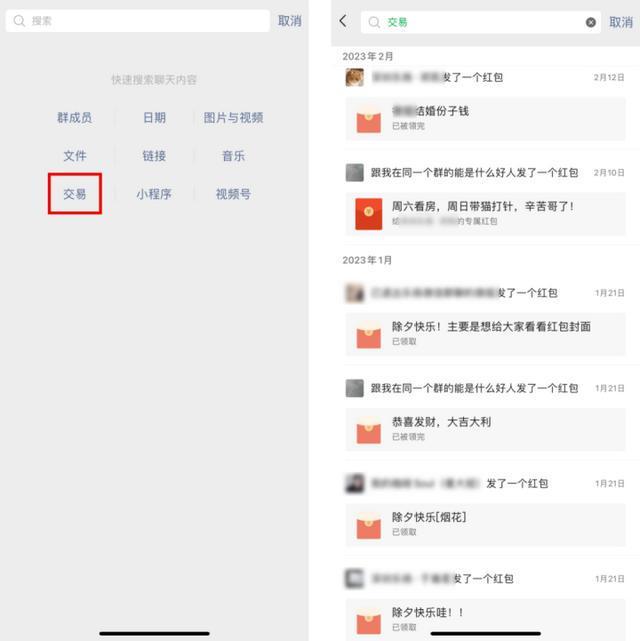进入聊天详情点击“查找聊天内容-交易”,可以看到全部的交易内容,红包、转账都能查,每一次惊喜都有痕迹。
