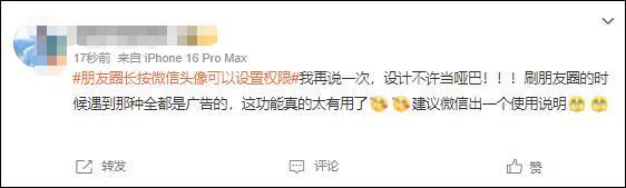 今天,朋友圈长按微信头像可以设置权限冲上热搜。