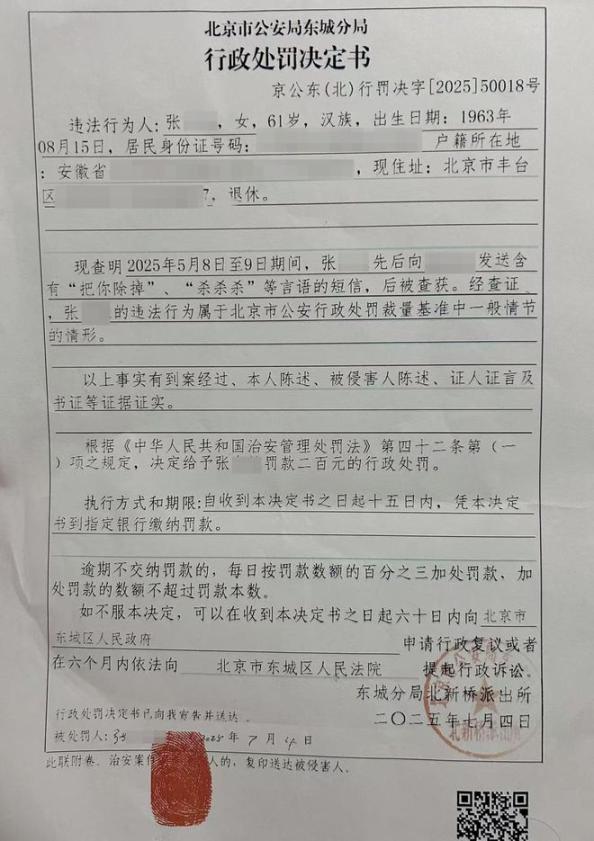 两份来自警方的行政案件立案告知书和行政处罚决定书显示,2025年5月8日,莫女士报案称被威胁人身安全案立案,7月4日,东城分局北新桥派出所查明张某某向莫女士发送含有“把你除掉”“杀杀杀”等言语的短信,违法行为属北京市公安行政处罚裁量基准中一般情节的情形,给予张某某罚款200元的行政处罚。