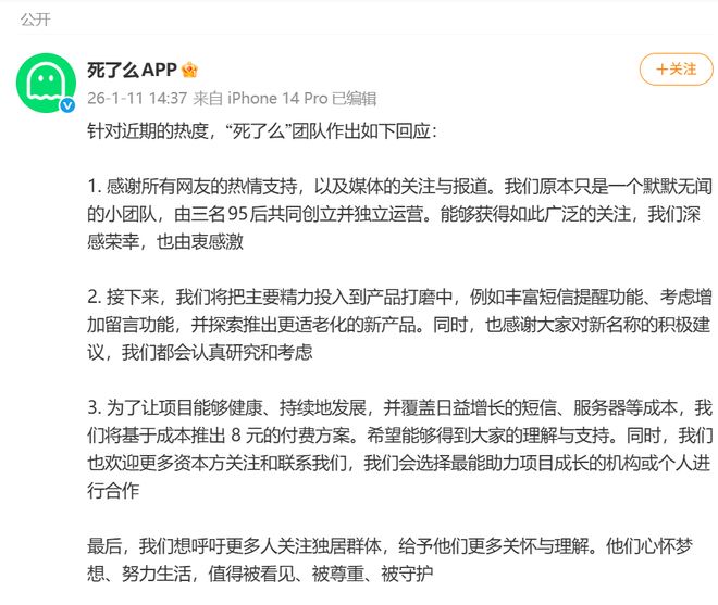1月11日,@死了么APP发文称,针对近期的热度,“死了么”团队作出如下回应: