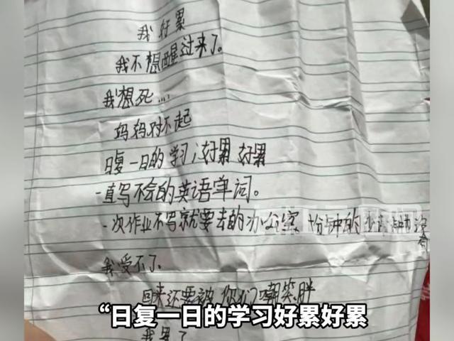 那张纸上字迹稚嫩却沉重:“我好累,我不想醒过来了。我想死,妈妈对不起,日复一日的学习,好累好累,一直不会写的英语单词。”